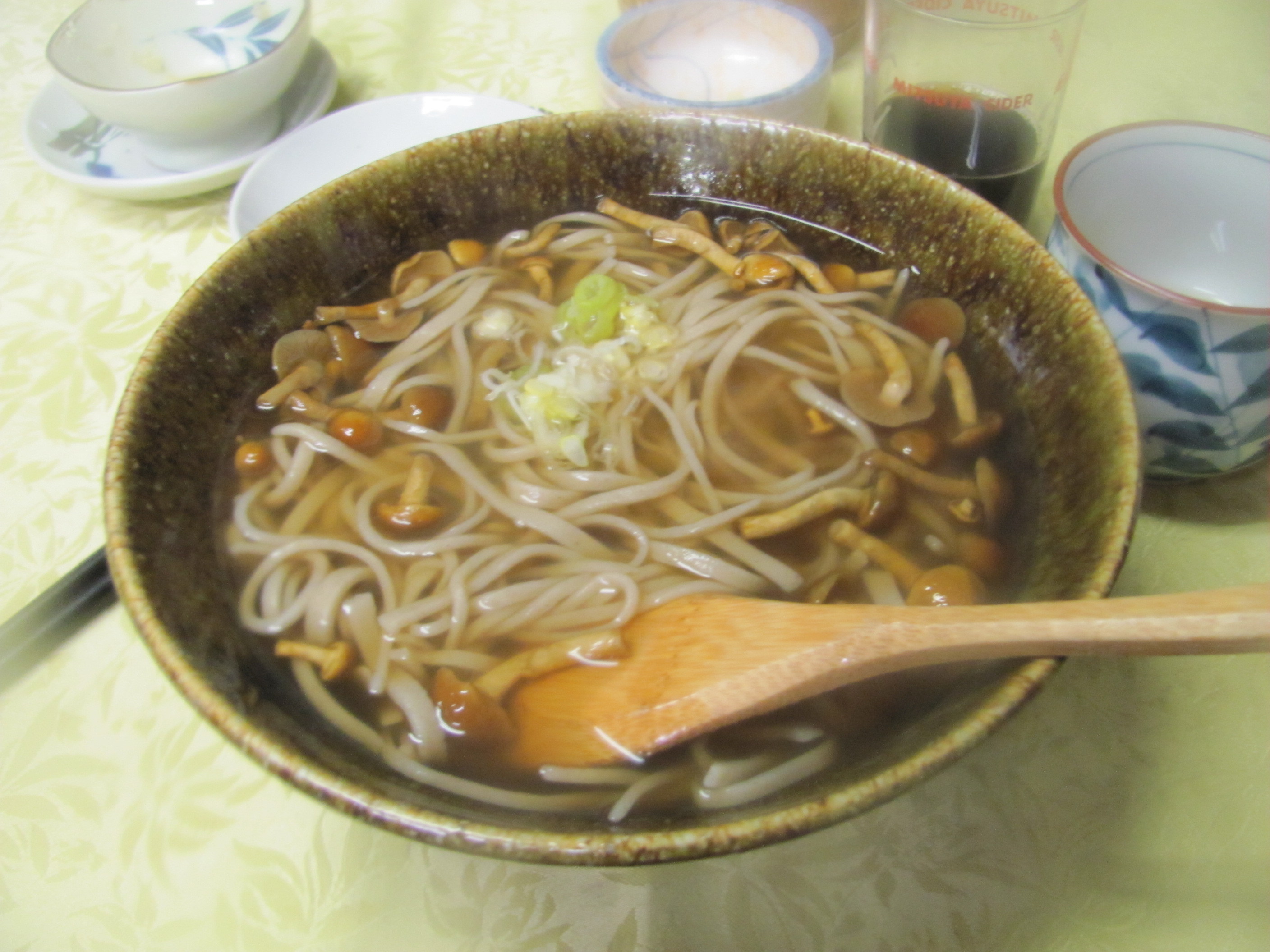 As for soba proper, one of the places my friends and I stopped was a cozy little soba restaurant called Rausuan (羅臼庵) outside of Jigokudani, where the “snow monkeys” live and bathe in the natural hot springs. It’s not too far from the Nagaden bus stop. We went in, and the waitress offered us an English menu, but I asked for a Japanese one as well. (We ended up needing the English because we had no idea what one of the side dishes was.) The hot-soba special of the day was kinoko soba, or soba with mushrooms. It came with a variety of soba-based side dishes and soba tea and cost 1100 yen. This soba was incredible. The flavor of the broth, the mushrooms, and the texture of the noodles were all a delight, and the portion size was perfect.