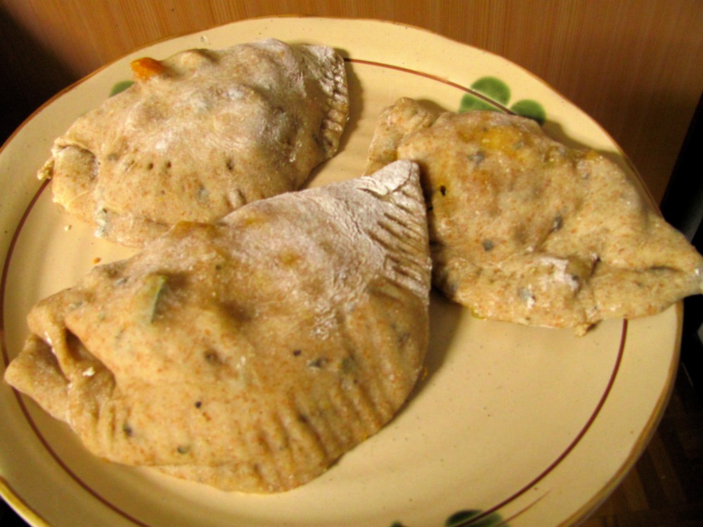 One recipe I had wanted to make for a while was “Squash-Apple Turnovers” from Cooking Light, but I was deterred by the use of canned biscuit dough. Not only is that not in the spirit of this blog, but you simply can’t buy that kind of thing in my neck of rural Japan. (I suspect I would be hard-pressed to find it anywhere but a big import store in Japan, but I’ve never seen any while hunting down peanut butter.) I decided to alter Cooking Light’s “Sage Dinner Rolls” to become the crust, and it actually worked perfectly—I didn’t have extra dough or filling.
