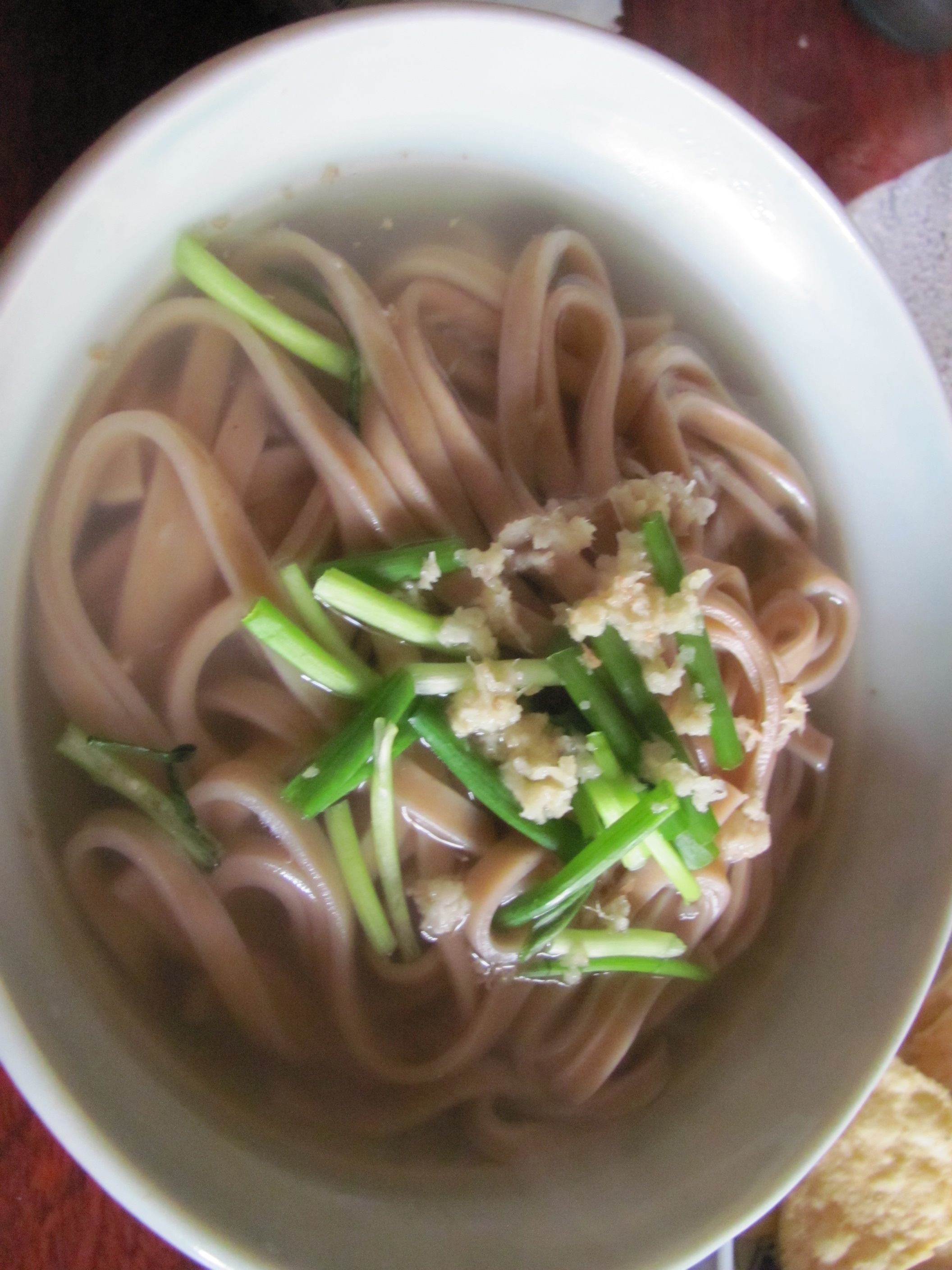 I decided on a bag of Ikemoto Shokuhin Iwakuni Renkon Soba: two servings of dried soba noodles made of renkon and packets of stock to make the soba broth. The company also sells renkon ramen and renkon udon. I followed the directions on the packet (boil noodles, mix stock and hot water, serve hot); added diced green onions (negi, ネギ) and freshly grated ginger (shôga, ショウガ); and served with a side of kinpira gobo and carrots.