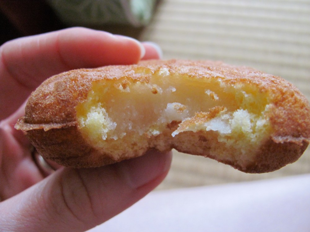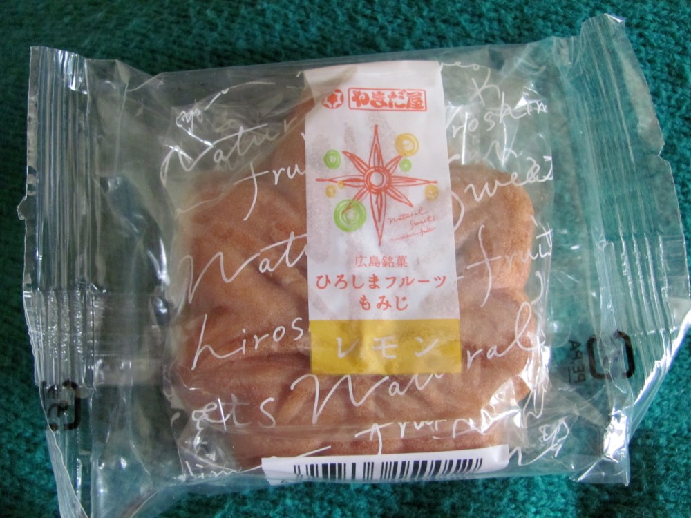 Hiroshima is famous for citrus fruits, and this lemon manjû, labeled as Hiroshima Fruit Momiji: Lemon (ひろしまフルーツもみじ レモン) reminded both of us of a lemon Girl Scout cookie. Like the Aka Momiji, this variety is also mixed with ingen mame instead of azuki.