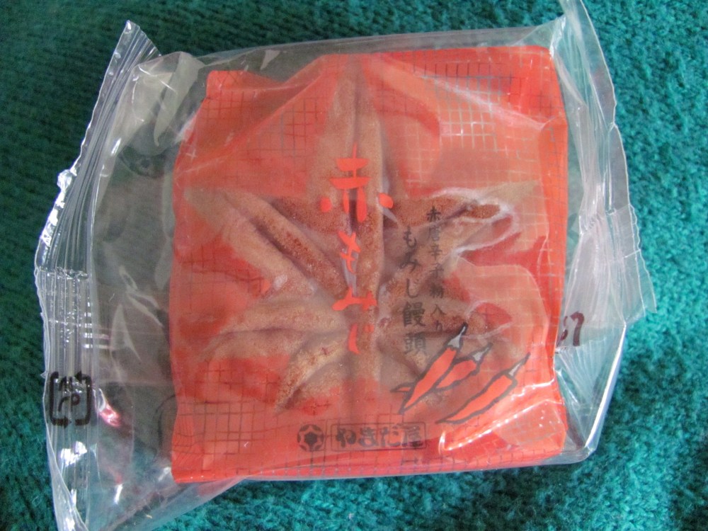 Since most of the momiji manjû I saw came in sweet flavors like azuki (traditional), fruit or nuts, the chili-pepper (aka togarashi, 赤唐辛子) variety really jumped out at me. The filling and shell are both reddish. According to the website, this flavor is made with powdered capsicum (chili pepper) and ingen mame (インゲン豆)–I get wax bean as a translation for this; most pictures look like the green beans I buy at the grocery stores here. Shiro [white] ingen mame (白インゲン豆) are navy beans. Are there any bilingual bean experts out there?