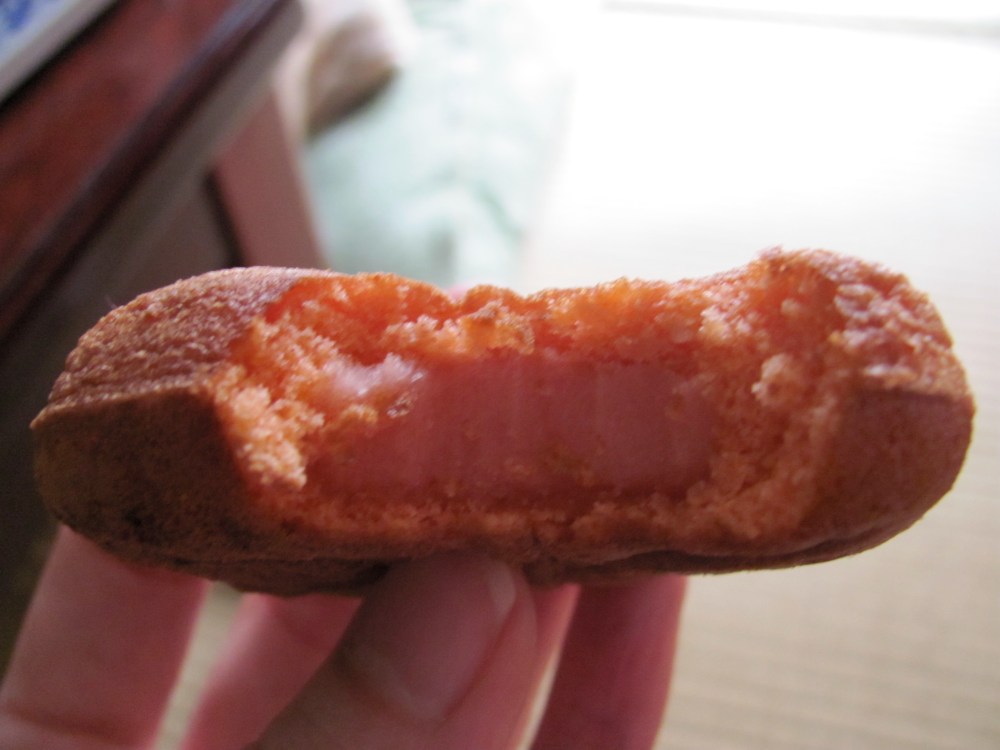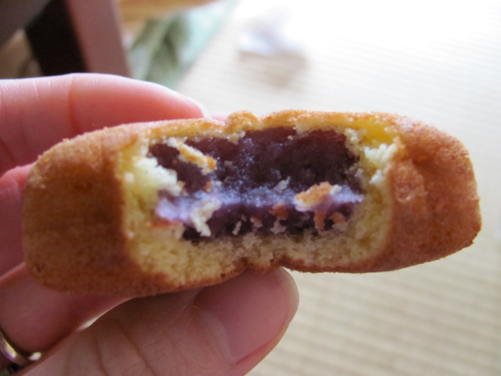 My husband said it reminded him of a Twinkie, at which I promptly headkotatsu’d. (That’s headdesking for residents of Japan.) Having maybe only every eaten one Twinkie in my life, I wondered if his assessment was because the filling is fairly sweet, as beni-imo typically is in okashi, but he ultimately decided it was the outer cake shell that reminded him of a snack cake. I personally thought the shell tasted more like a castella (カステラ) or dorayaki (どらやき) “pancake”–it’s about the same kind of batter, after all. My favorite beni-imo okashi are still the tarts (紅芋タルト) and ice cream I had in Okinawa, but if you enjoy beni-imo, you won’t be disappointed.