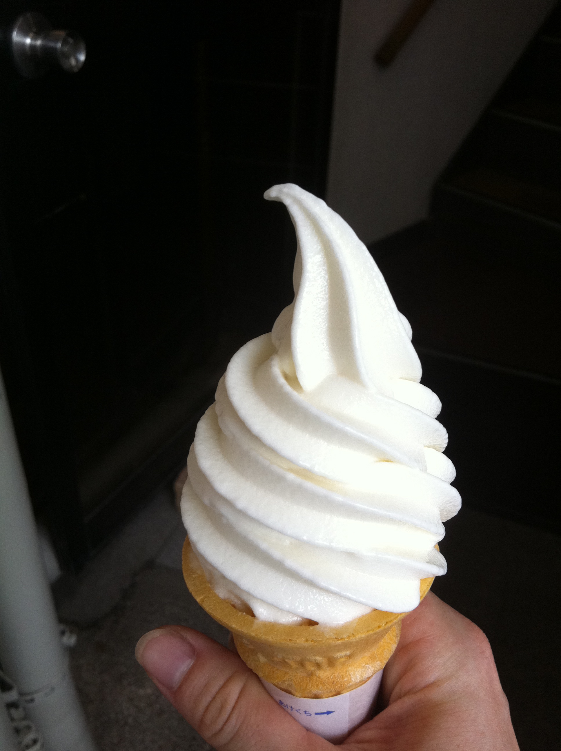 A sign on the stand claims that okara ice cream has 40% fewer calories than regular ice cream and that it also doesn’t melt as fast as regular ice cream. According to 栄養計算 (“Nutrition Calculator,” a very useful website for looking up weight-based nutritional information on Japanese food) 50 grams of okara has only 56 calories and 34% of your daily recommended dietary fiber, so I can’t say I’m surprised that the nutritional value and the melting point are different. The favor is very vibrant vanilla; the price is fairly average for Japanese ice cream, and I felt it was a good size for soft serve–maybe 100 grams, not including the cone.