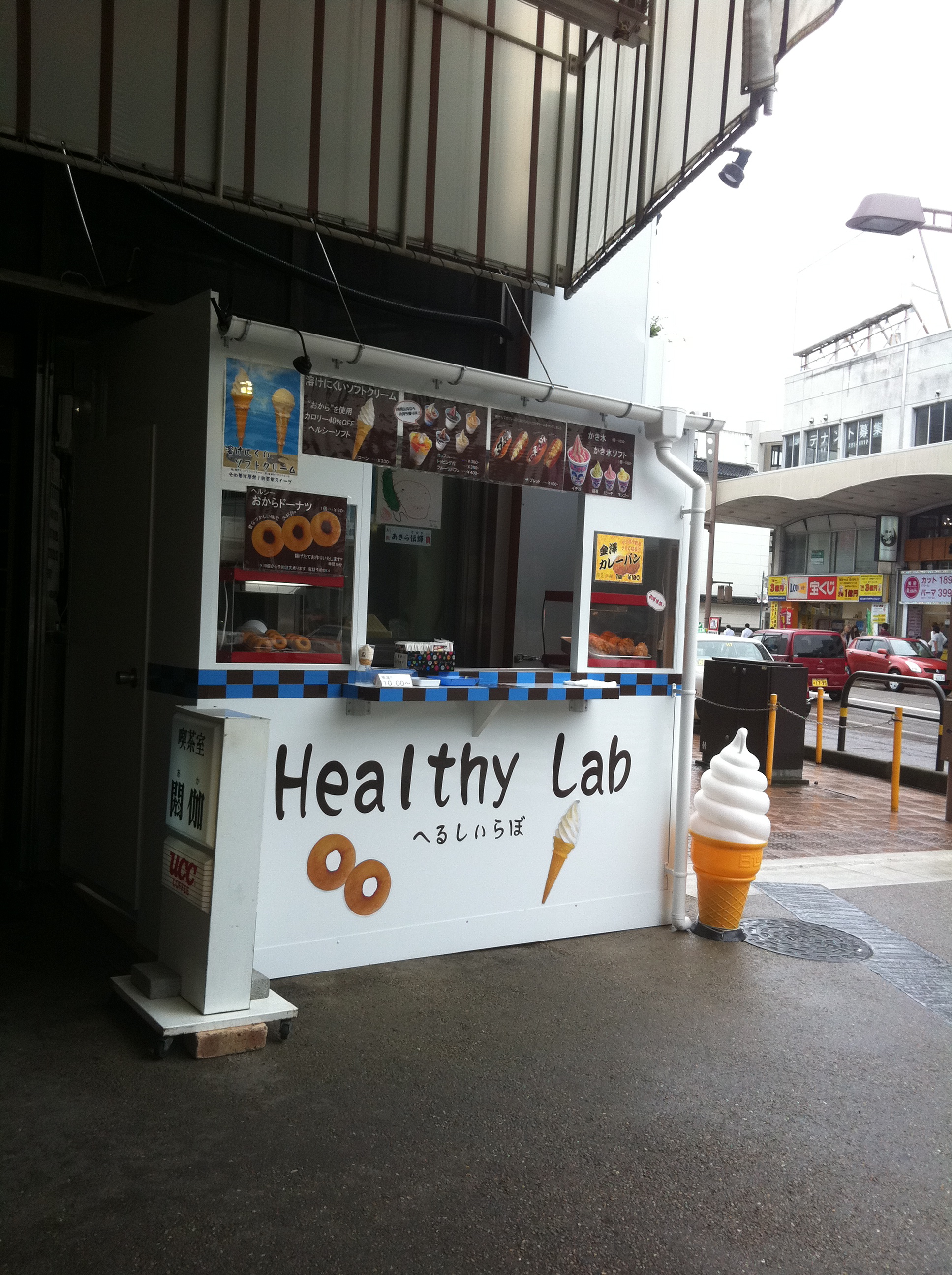 Last week, I was wandering around the market and came across Healthy Lab (へるしいらぼ), a small permanent stand at the M’Za entrance of Ômicho that specializes in ice cream and donuts made from okara (おから), a tofu byproduct. I’d only ever sampled the donuts, which have the density of sweets made with fresh okara, but okara soft-serve ice cream sounded perfect on a blazing August day in the two weeks when we had no rain.