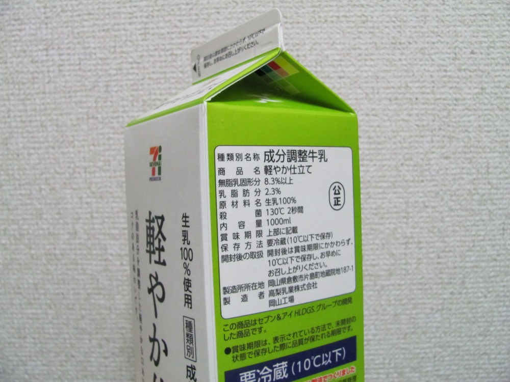 - Use 2.3-2.5% milk. For whatever reason, my yogurt works best with this rather than skim or whole. ~2% milk is actually not that hard to find in Japan. 7-11’s store-brand cow’s milk (gyûnyû, 乳牛) is 2.3%, and I’ve found at least two other brands in Kanazawa. Just look on the side of the carton for the percentage of fat (nyûshibôbun, 乳脂肪分). Please note that Japanese milk tends to be labeled as “100% milk” on the front to indicate that it is not a yogurt drink or Calpis or milk coffee (or cut with water).
