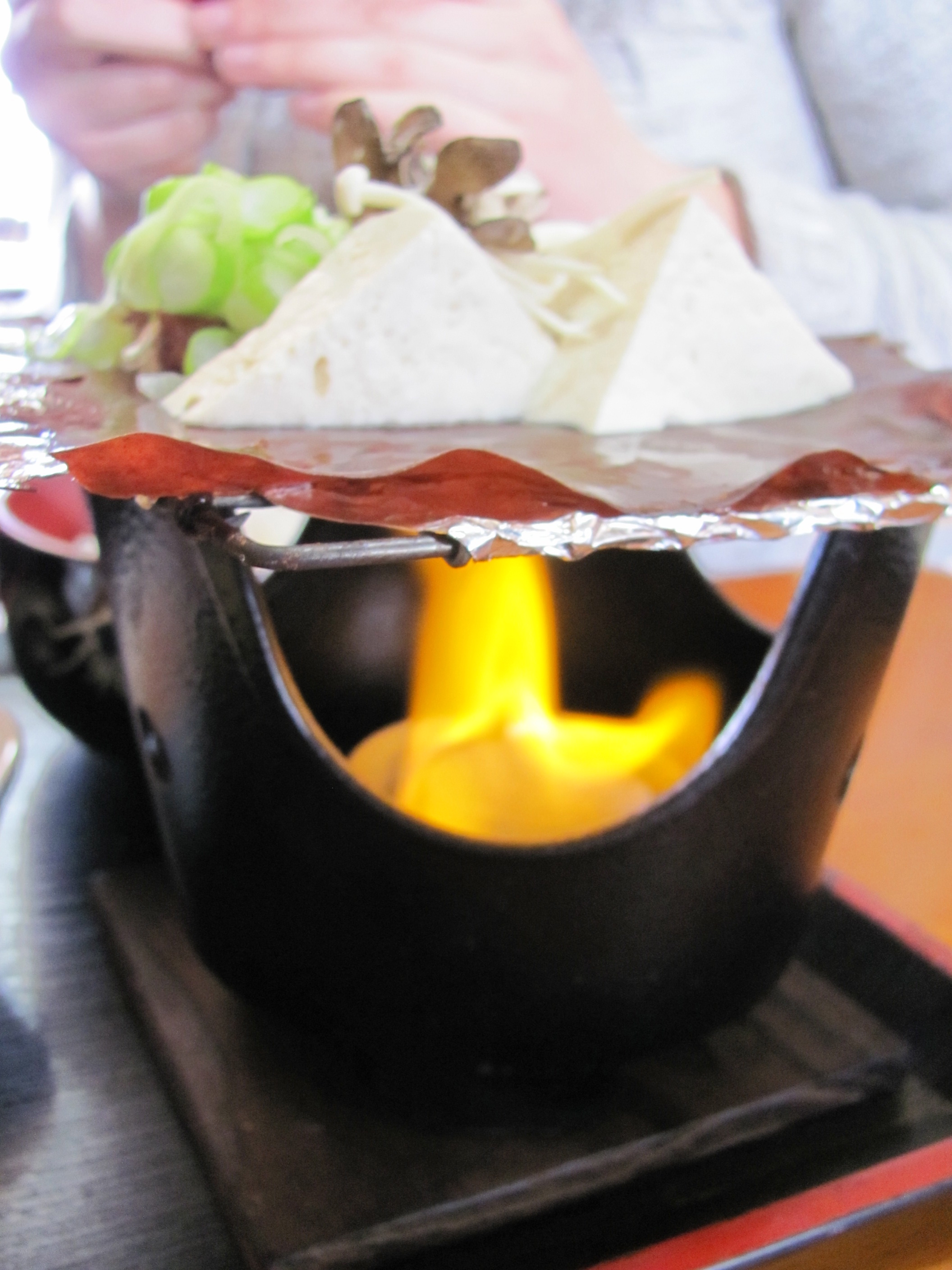 To enjoy the hôba miso yaki, a staff member brings out a Sterno-like device, which is placed into a ceramic or metal grill and lit. The magnolia leaf rests on a piece of foil on top of the grate, and the heat cooks your food on top of this leaf.