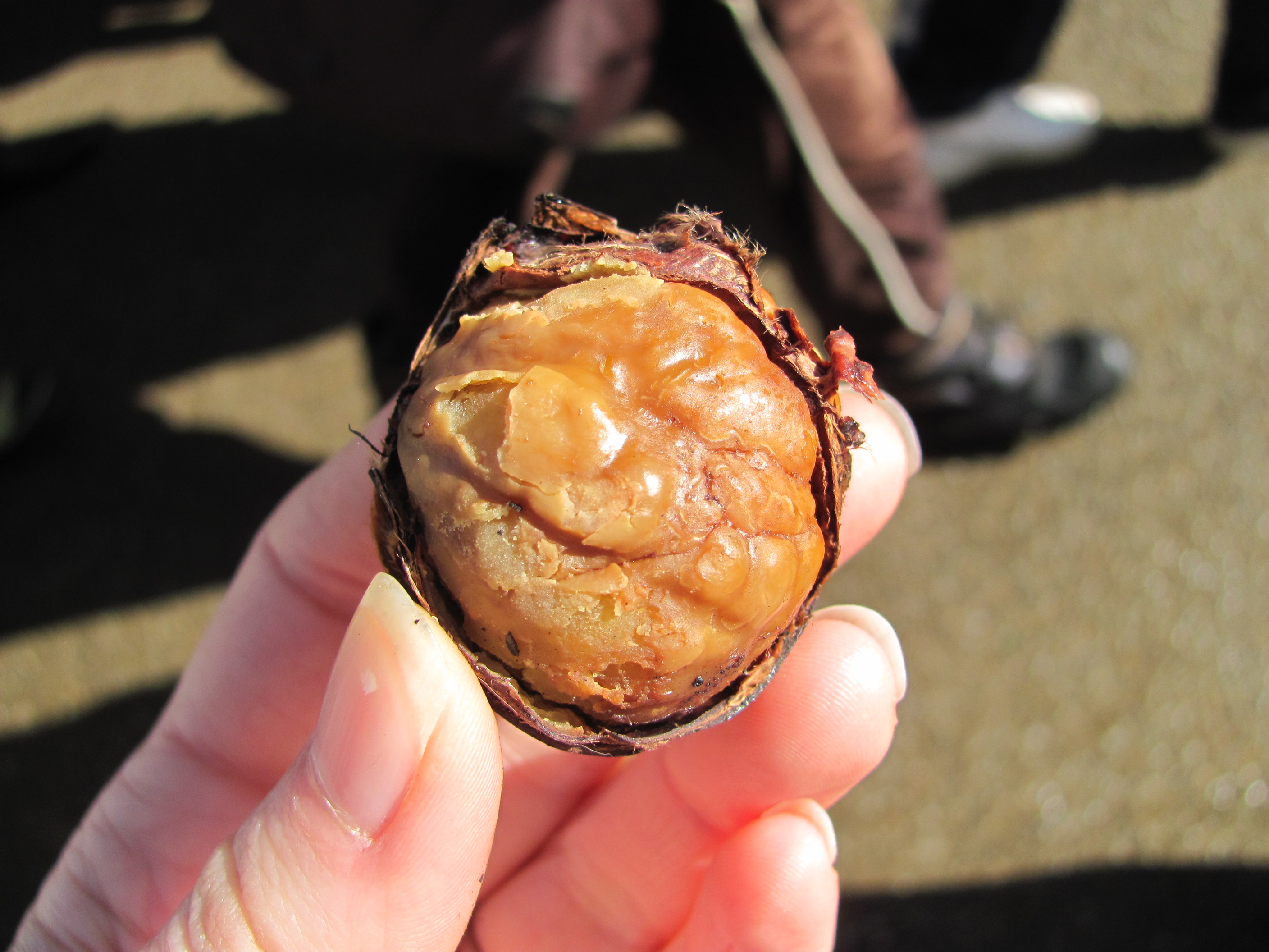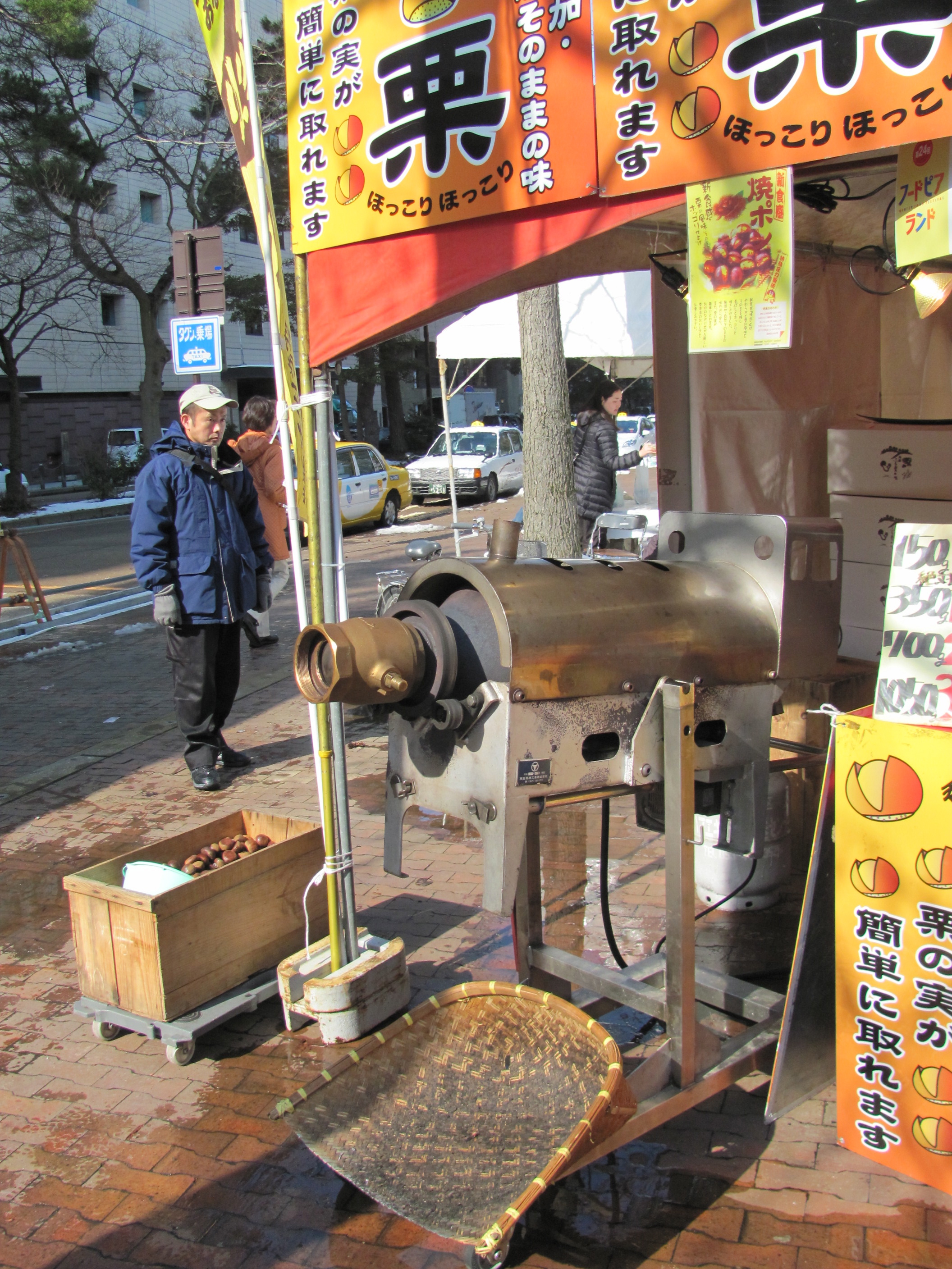 After getting led over to a yaki-imo stall by Doraemon for free soup and yaki-imo to go, a group of us entered the festival near the Atrio department store and ran straight into a roasted chestnut (kuri, 栗) stand. Some train stations, particularly Kyoto Station, and tourist sites across Japan sell these, and they’re always a treat when I can find them in Ishikawa.