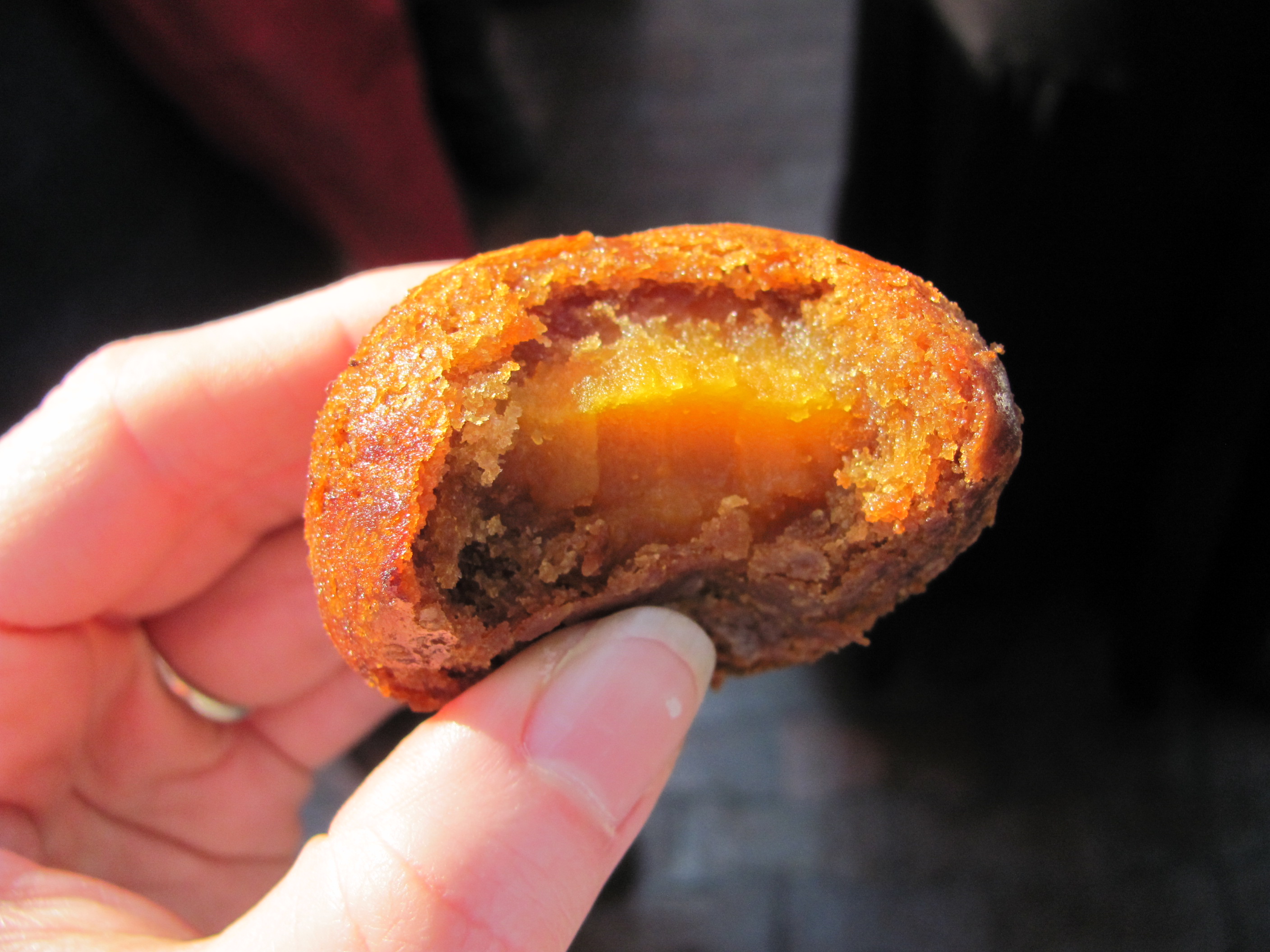 While I was buying my (expensive at 500 yen/100 grams) chestnuts, my group had discovered a stall that sold fried manjû made with the Kaga yasai Gorojima kintoki, an heirloom Japanese sweet potato grown in Ishikawa.