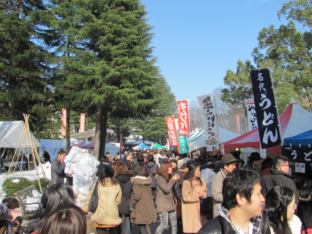 During the month of February in Kanazawa, there was a series of events called Foodpia (fûdopia, フードピア), one of which was Foodpia Land, a food fair held from 10-12 February in Kanazawa’s Central Park (中央公園). Admission was free, which was nice, as most of the other events require a reservation and were costlier to attend as many were course dinners with entertainment. There were other 100 booths serving cuisine from all over Japan and even some international dishes. Ishikawa was well represented, of course!