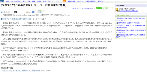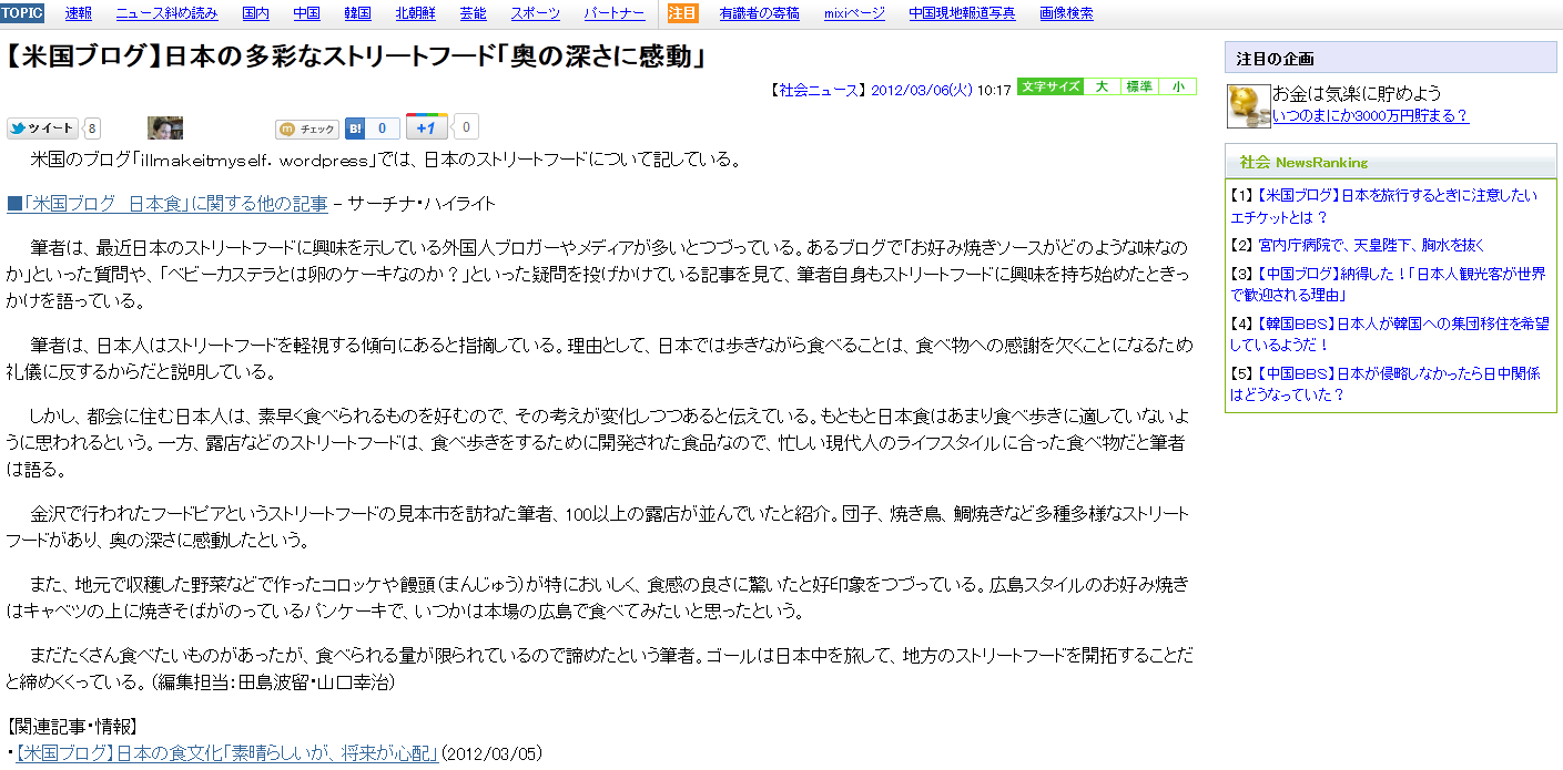日本語圏の読者の皆様、2012年3月6日にサーチナで載せられた「【米国ブログ】日本の多彩なストリートフード『奥の深さに感動』」という翻訳要点を読んでいただき、私自身のブログをご覧になって、本当にありがとうございます!又、サーチナの編集担当の田島波留様と山口幸治様が私の記事とブログを読んでいただき、要点をご翻訳して載せていただき、何よりも感謝しております。大変驚きました!笑 しかし、「奥の深さに感動」という表現、どちら書きましたか?3年間日本で住み、8年間日本語、日本の文化を勉強したので、露店とかストリートフードが新しい経験ではなかったです。。。又「外国人」の皆は観光客ではない。