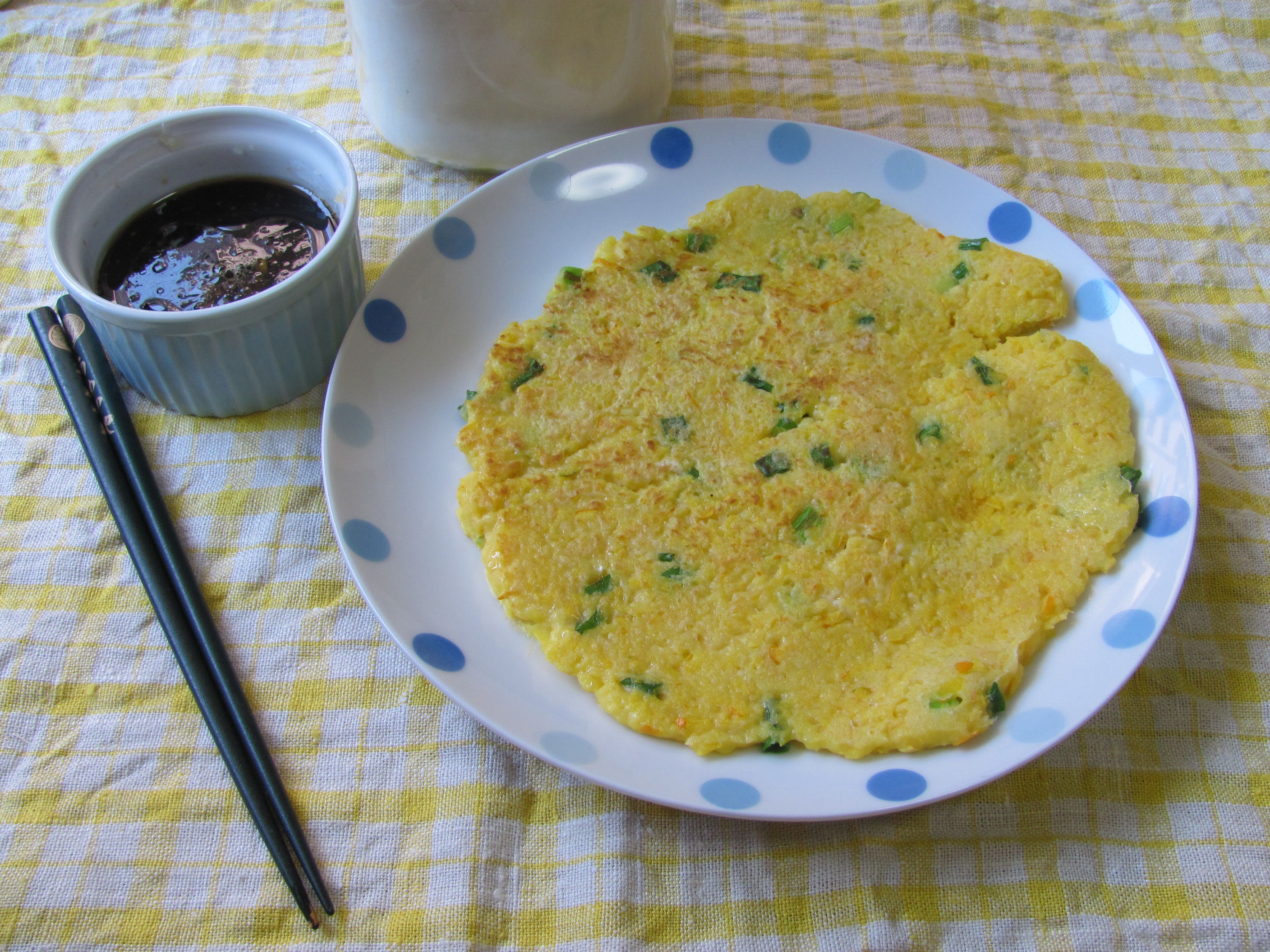 Chijimi, or buchimgae (henceforth not italicized), is a savory pancake, a flatter cousin of okonomiyaki, and is one of the Korean foods that has been integrated into Japanese cuisine particularly Osaka-style cuisine. My host family served chijimi with ponzu sauce, but korinky has a bright citrus flavor, adding more citrus-based ponzu would be overkill (or underwhelming), so this recipe includes a simple sauce made of garlic, soy sauce, sesame oil, and vinegar.
