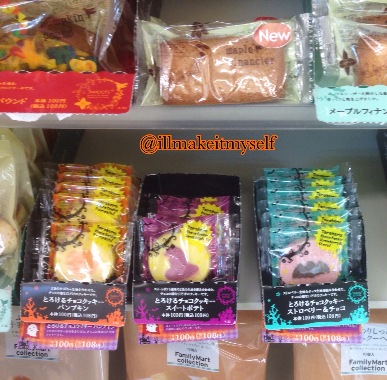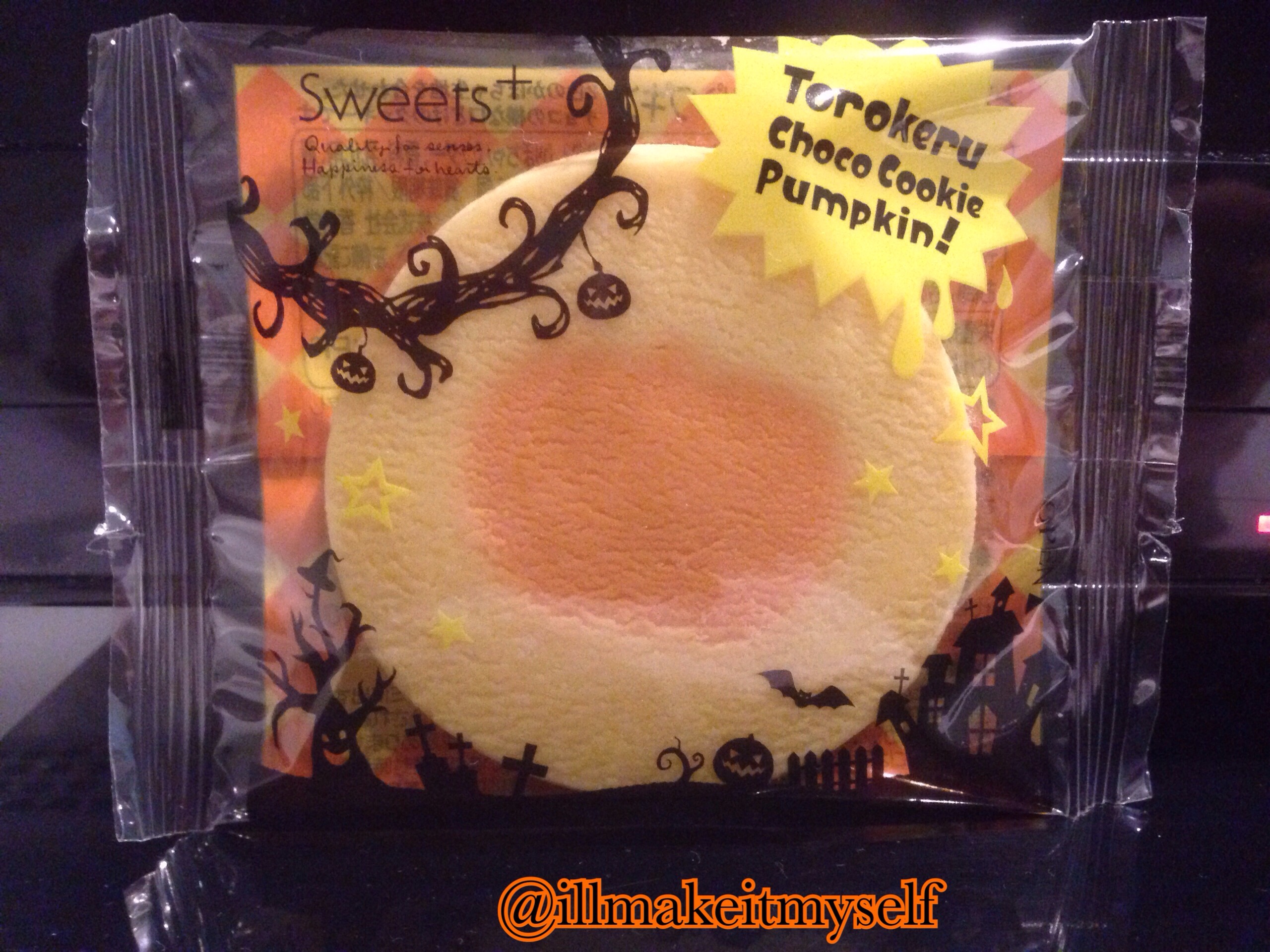 And here we have the “Torokeru” cookies from Sweets + at Family Mart: a pumpkin cookie with a pumpkin design, a sweet potato cookie with a witch’s hat design, and a strawberry-chocolate bat. Look at that Halloween packaging with the haunted house and ghost designs.