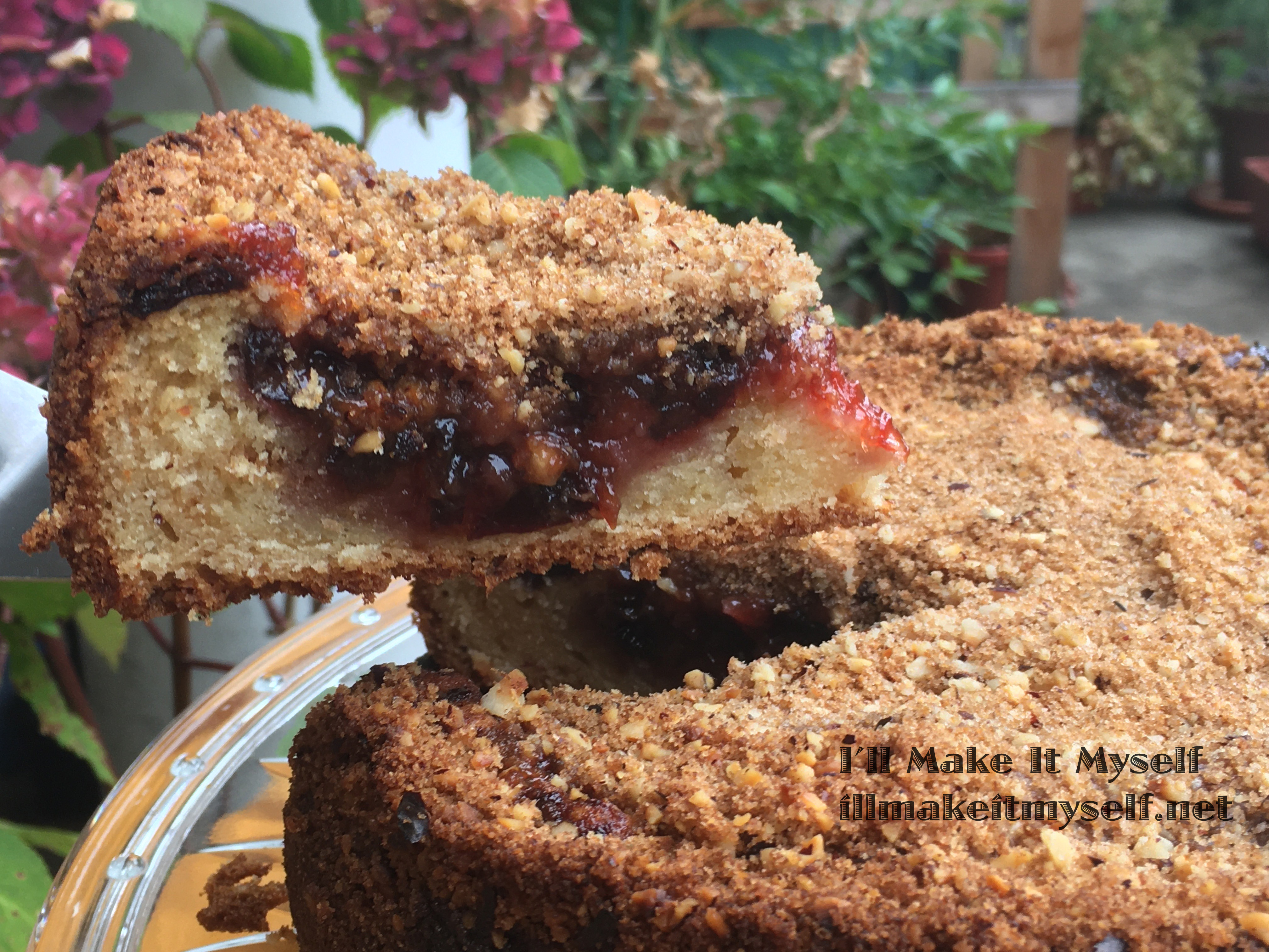 Run the food processor until blended, then sprinkle the streusel over the jam on the cake.